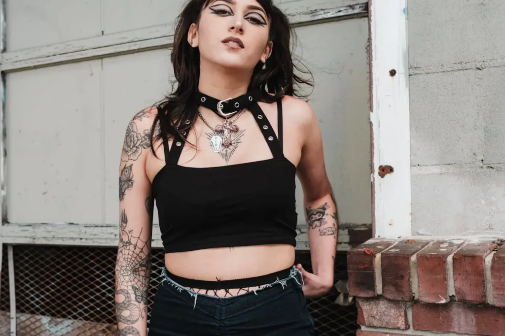 - Charakterystyczna estetyka – jej styl często kojarzy się z kabaretkami, łańcuchami, kolczykami i ciemnymi ubraniami.